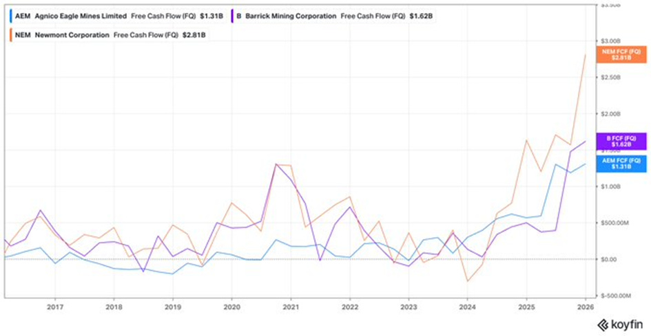 The big three—Newmont, Barrick, and Agnico Eagle—have just posted record-high free cash flow figures for 2025 (with Q4 numbers setting new benchmarks). Shareholders should brace for meaningfully higher dividends, buybacks, and potentially accretive growth moves.