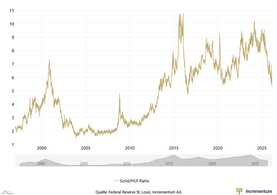 Yet context is key: even as the HUI surges with impressive recent strength—now charging toward (and eyeing a decisive breakthrough above) the psychologically important 1,000 mark—the HUI/gold ratio still sits well below its explosive 2000s bull-market peaks, i.e. the early-2006 all-time high and the dramatic September 2011 spike.