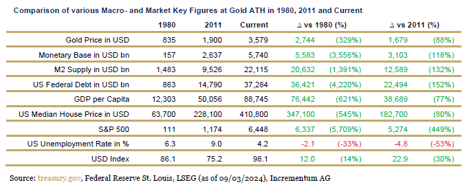 By this logic, if gold had merely kept pace with the expansion of the monetary base since 1980, its price today would not sit just under USD 3,600. Rather, the gold price would exceed well over USD 30,000 per ounce.