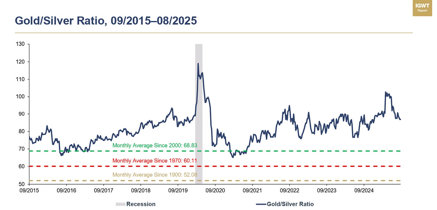 Nonetheless, investors should note that a mere reversion to the historical mean of the gold/silver ratio since 1970 would translate to a USD 59 silver price at today’s gold price of USD 3,550.
